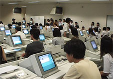 今年も、8月3日(月)に高校3年生を中心に550名がキャンパスに集い、その内のべ280名が語学センターの施設を見学しました。語学センターLL第1教室と自習室で機能デモンストレーションが各2回あり、国際学部の岩井千秋助教授と渡辺智恵助手が担当しました。LL1のデモでは、教室ブース数60の倍以上の方が参加し、立ち見があふれる大盛況で、語学センターはオープン・キャンパスの一つの”顔”であることがおのずと示されたといえます。